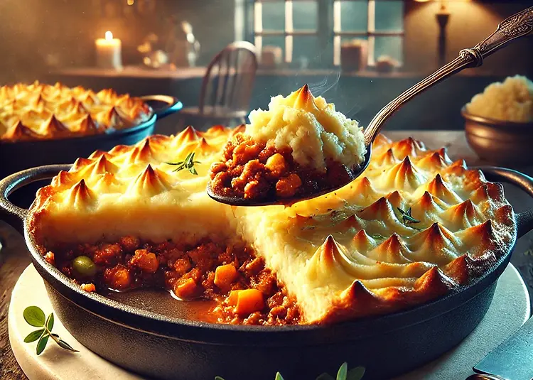 A comforting dish of savory ground meat with a rich gravy, topped with creamy mashed potatoes and baked to perfection.